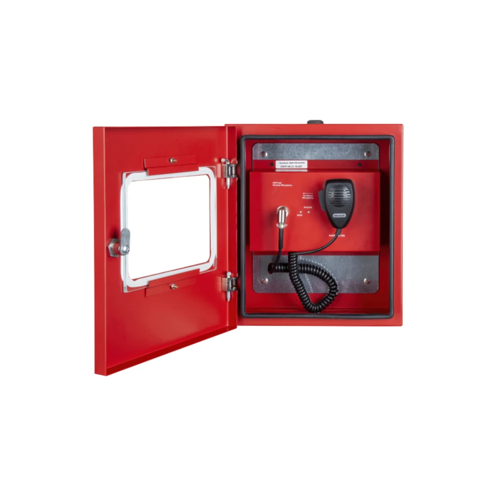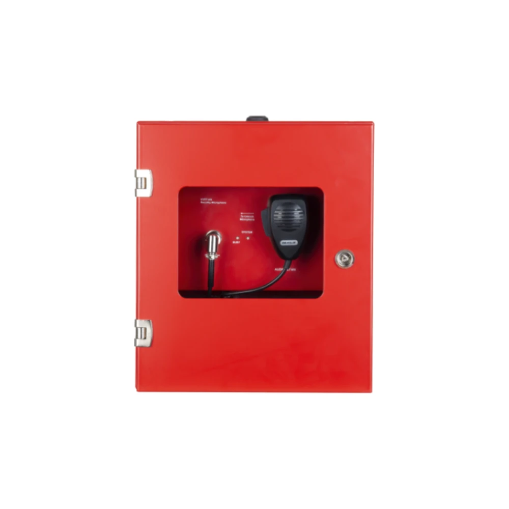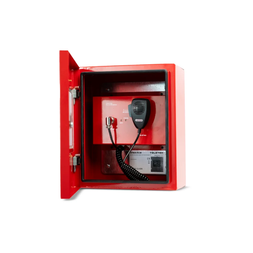 Le SPIKA-RCM est un coffret mural d’urgence rouge équipé d’un microphone portable PTT (Push-To-Talk). Conçu pour offrir la priorité absolue au sein du système d’évacuation vocale SPIKA, il est généralement réservé à l’usage des pompiers pour la diffusion de consignes vocales directes. Certifié EN 54-16, il se connecte au bus d’urgence du système et est protégé par une fermeture à clé.